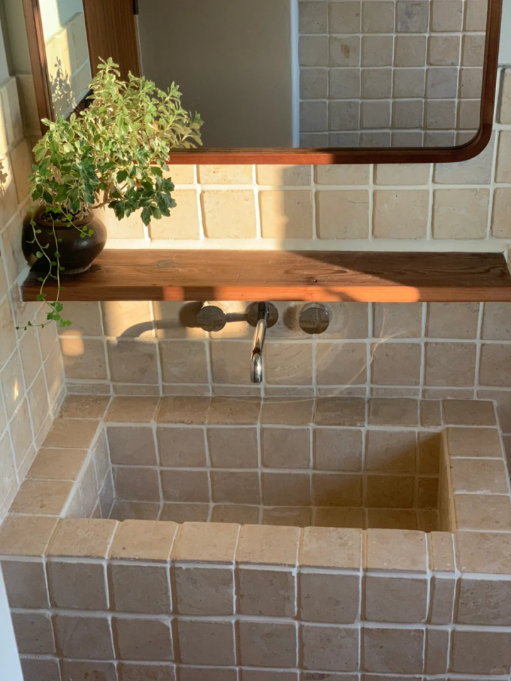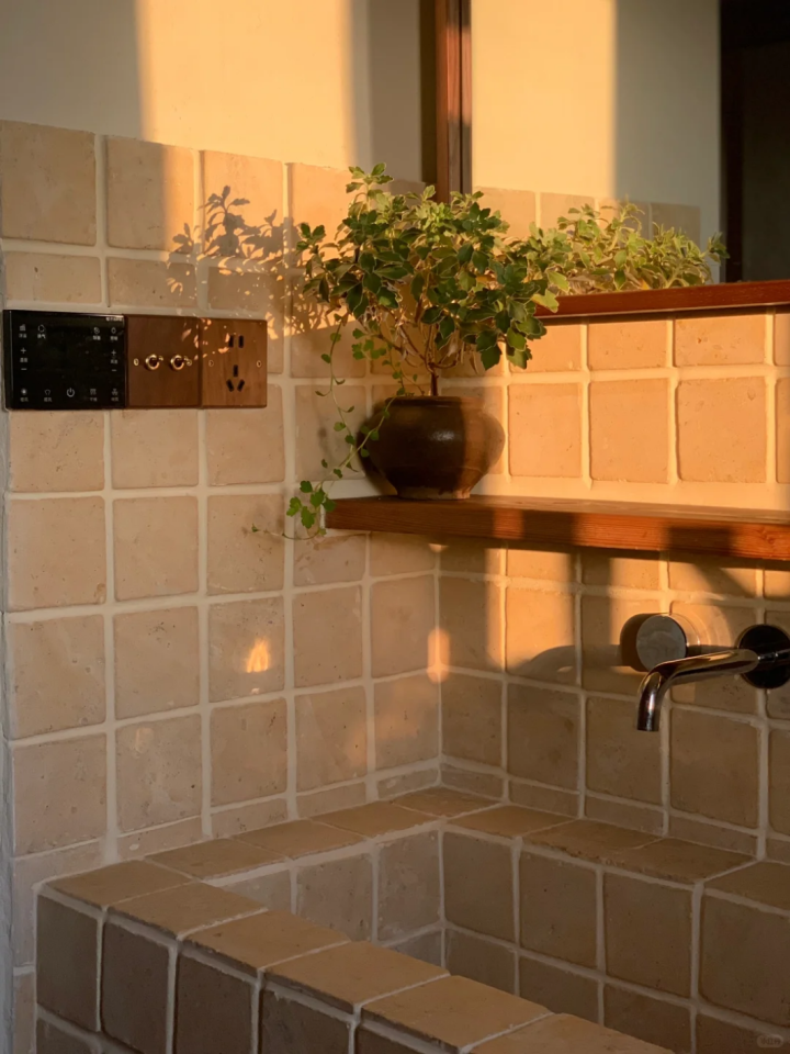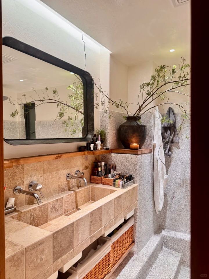 我家的现浇洗手池,用了莱姆石材质,搭配原木色的置物架,简直是自然风的天花板。