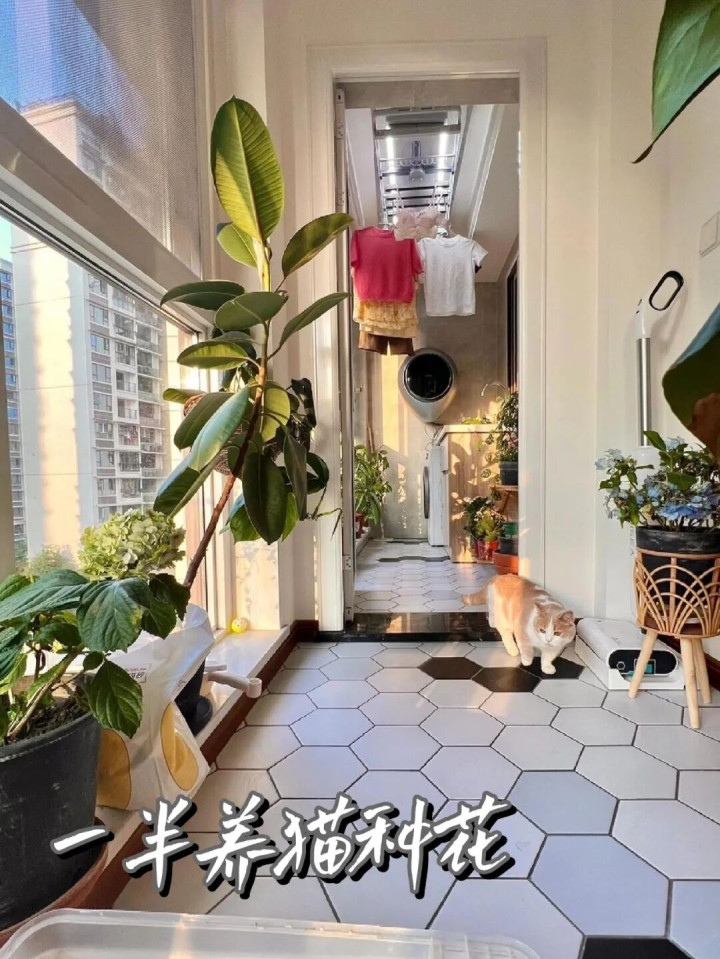 开放的部分可以种月季、多肉这些喜阳植物,而且晾晒衣服也不影响休闲区,太完美了。