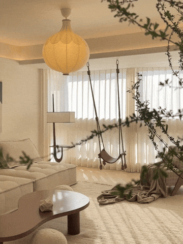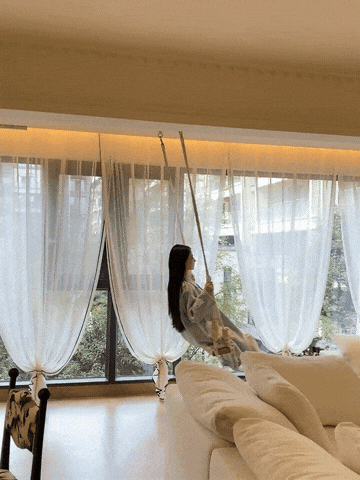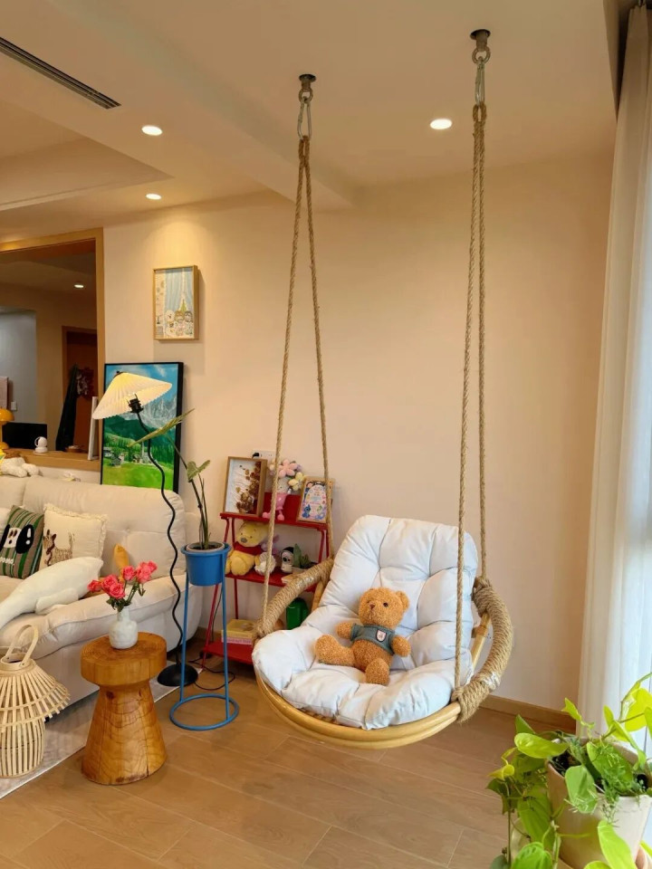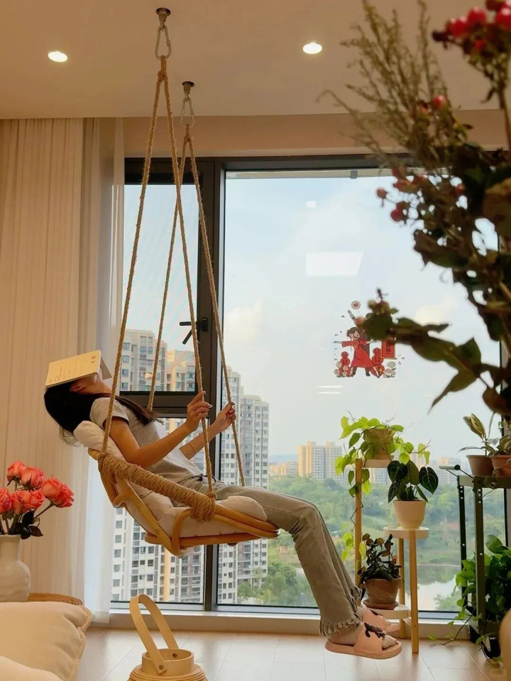 我家在客厅的承重梁上装了秋千,周末窝在上面追剧、看书,简直是神仙体验。阳光洒在身上,秋千轻轻晃悠,压力瞬间没了,我家猫都天天抢着坐。
