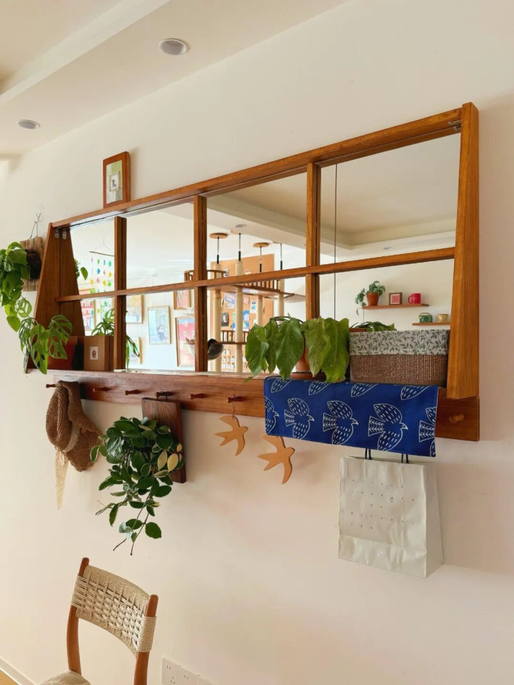 先给墙面找平,选一块大小合适的镜子装上去,上下加了两块2米长的木板搁物,装饰一下,瞬间就有了生机勃勃的感觉。