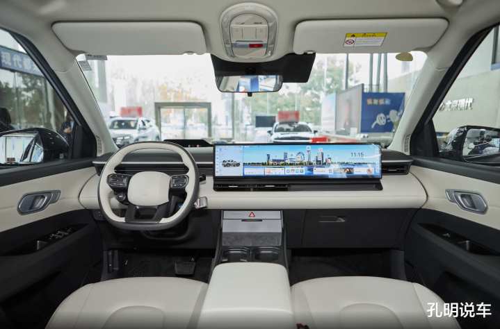 车内的感觉已经和大多数的自主品牌非常接近,确实有点国内新势力的韵味,尤其整个台面布局了整体的大屏幕,整块大屏已经做到27英寸,中间是没有任何接缝的,这就在整个右侧形成了融合的副驾驶娱乐区域,细节上配置水平也不错,比如提供有bose音响,全景天幕还有电动遮阳帘,甚至提供有这个级别比较少见的夹层隔音玻璃。